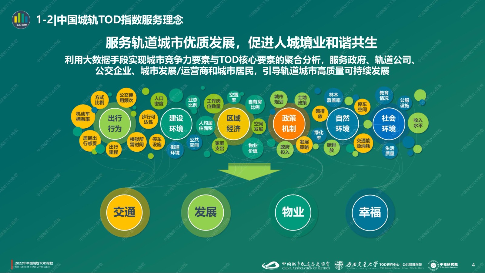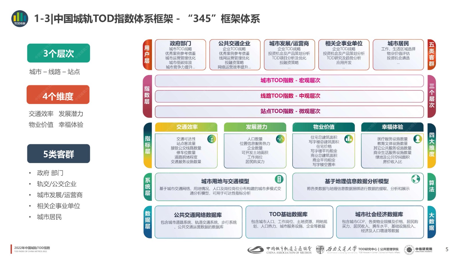 TOD指数研究汇聚协会、业主、高校、研究和咨询机构的专业力量,创新采用大数据手段,借鉴地产指数研究方法和经验,并征求城轨资源经营方和地产合作方意见,研发编制而成。经多方调研和专家评审,科学构建“345”指数框架体系,通过对土地、物业、交通、人口、产业、公共空间等关键要素之间互动关系的深入分析,旨在评估TOD对城市发展和交通生活的影响,进而切实加强城市轨道沿线地区的规划引导,促进城市功能与交通功能的一体化发展,倡导崭新TOD生产和生活方式,实现高质量与可持续的人、城、境、业融合发展。