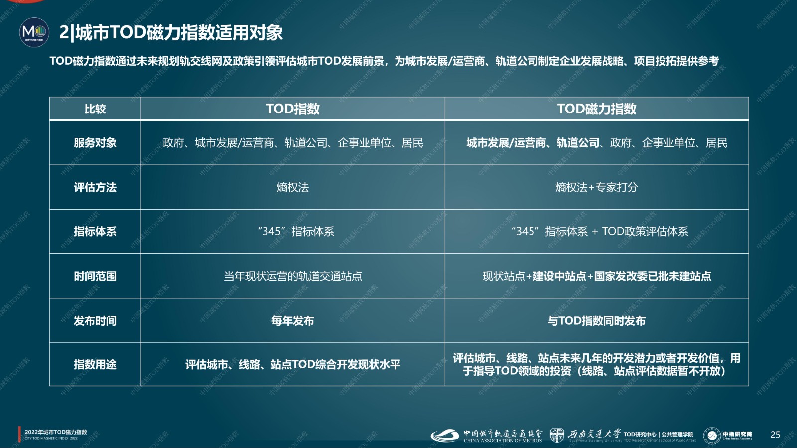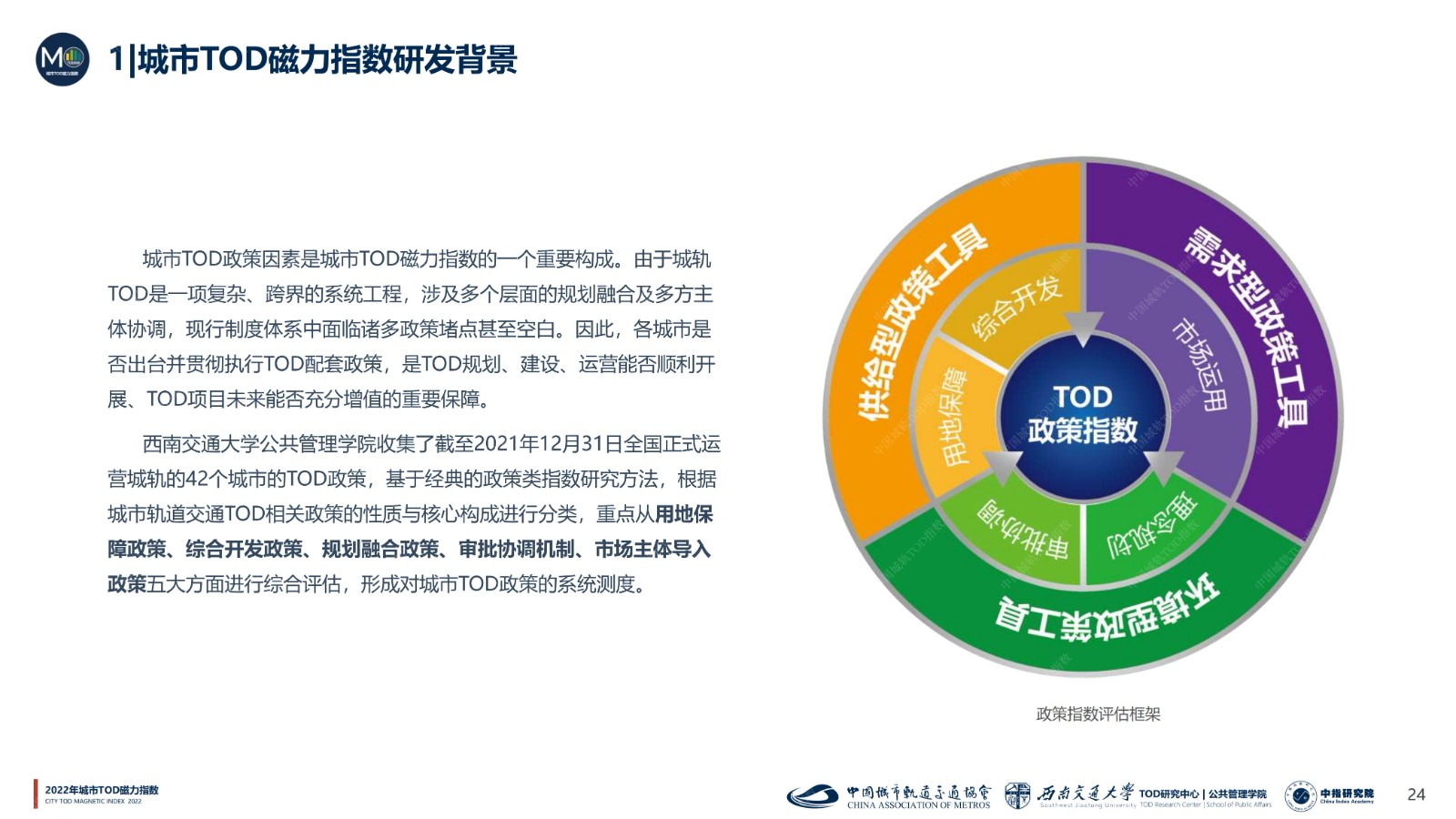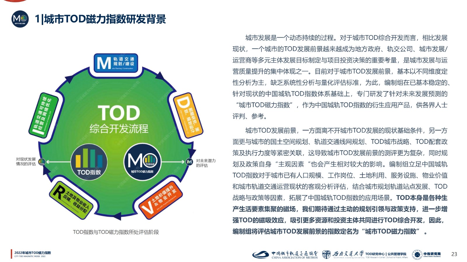 中国城轨TOD指数(以下简称:TOD指数),由中国城市轨道交通协会指导、协会资源经营专业委员会牵头,西南交通大学TOD研究中心/西南交通大学公共管理学院、中指研究院等共同参与,联合研发编制。初步研究成果于2017年11月在国内首发问世;2020年TOD指数踔厉奋发,赓续前行,面向全国发布《中国城轨TOD指数报告(2020)》,成功入选“2020年度城轨交通协会十件大事”;2022年TOD指数维实励新,精进臻善,创新提出“城市TOD磁力指数概念”,历时6个月终迎来《2022中国城轨TOD指数暨城市TOD磁力指数报告》预发布。