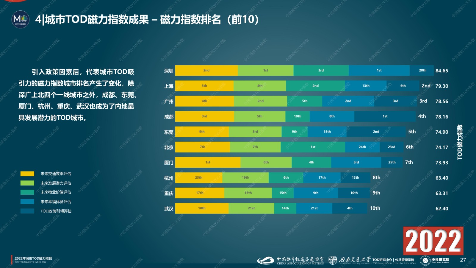 城市发展是一个动态持续的过程。对于城市 TOD 综合开发而言,相比发展现状,一个城市的 TOD 发展前景越来越成为地方政府、轨交公司、城市发展/运营商等多元主体发展目标制定与项目投资决策的重要考量,是城市发展与运营质量提升的集中体现之一。为此,编制组在既有TOD指数基础上,结合城市规划轨道站点发展、 TOD战略与政策等因素,专门研发了针对未来发展预测的“城市 TOD 磁力指数",通过未来规划轨交线网及政策引领评估城市TOD发展前景。研究成果显示,TOD磁力指数排名前10的城市为深圳、上海、广州、成都、东莞、北京、厦门、杭州、重庆、武汉。